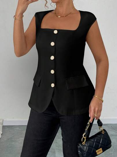 Elenzga 大码女式优雅办公装无袖薄款西装外套 - 黑色 - 查看 1