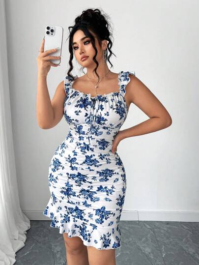 Elenzga 大码女式花卉印花拼色褶饰盖袖荷叶边下摆系带迷你连衣裙春夏季女式短裙夏季女式生日装女装 - 白色 - 查看 2
