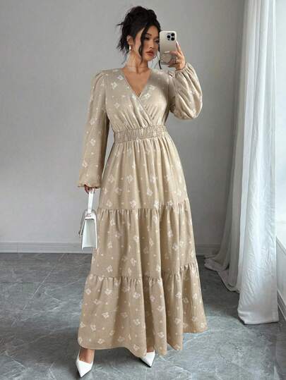Elenzga 大码女式法式休闲优雅V领刺绣花卉印花长袖连衣裙,秋冬款