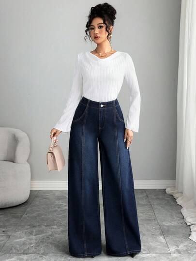Elenzga 女士休闲通勤水洗阔腿牛仔裤 - 深色水洗藍 - 查看 1