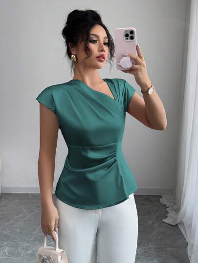 Elenzga 女士优雅休闲/度假/办公室装纯色缎面不对称肩部褶饰肩部修身短上衣,春夏季,绿色荷叶边上衣 - 水鴨藍 - 查看 1