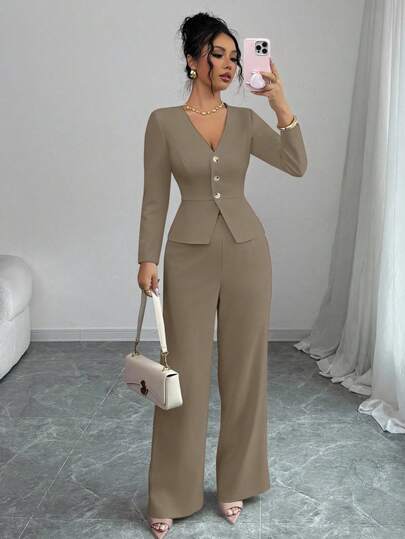 Elenzga 女士优雅长袖西装外套和裤子套装,商务/通勤风格,适合夏季、独立日、毕业典礼、返校 - 卡其色 - 查看 1