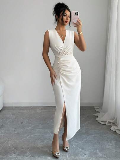 Elenzga 女士新款V领腰部褶皱不对称下摆开衩独特设计高端优雅教师服百搭时尚连衣裙 - 杏色 - 查看 1