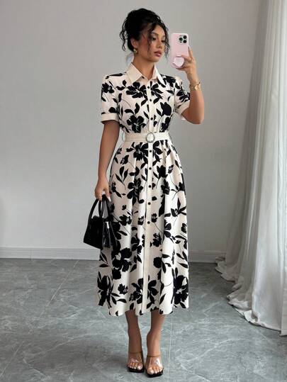 Elenzga 女式印花束腰度假优雅连衣裙,夏季 - 杏色 - 查看 6