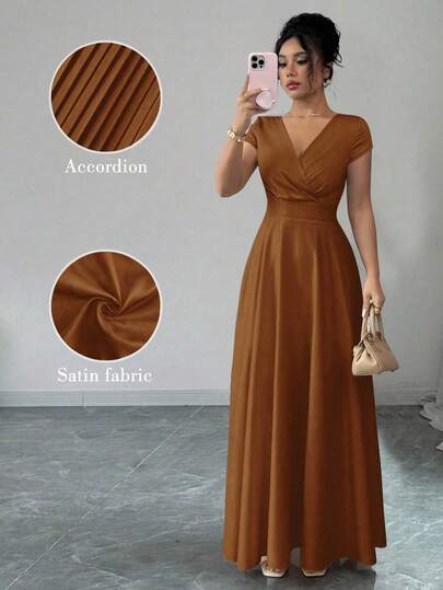 Elenzga 女士V领收腰优雅浪漫短袖连衣裙 - 咖啡棕 - 查看 1