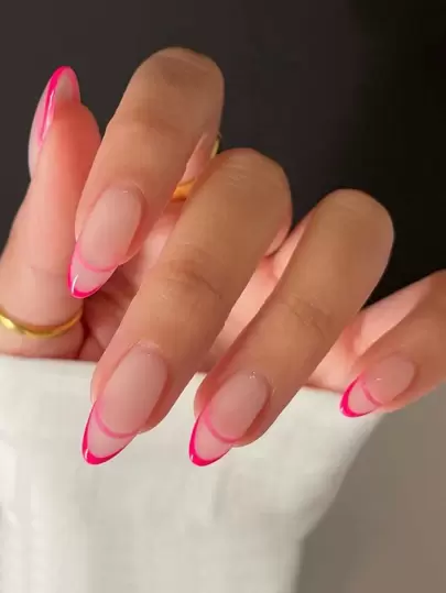 24 件中号杏仁按压指甲,带红色法式尖头和红线设计,光泽全覆盖假指甲,适合女性女孩日常佩戴 - 包括指甲锉和果冻粘合剂 - 粉色 - 查看 1