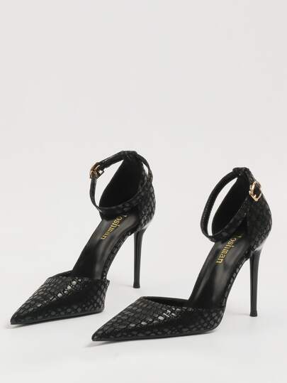 Ellevyn 秋冬季鳄鱼纹压花细高跟踝带高跟鞋,优雅派对风 - 黑色 - 查看 1
