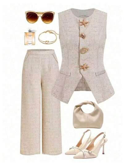Ellevyn 时尚通勤星形贝壳扣无袖上衣和裤子套装 - 杏色 - 查看 1