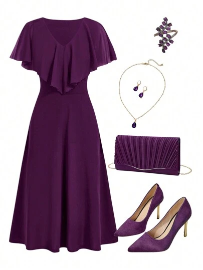Ellevyn 女士中長款綠色連衣裙,荷葉邊設計 - 紫色 - 查看 2