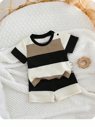 新生男婴/女婴两件套服装:柔软针织彩色条纹圆领短袖上衣和松紧腰短裤 - 彩色 - 查看 1
