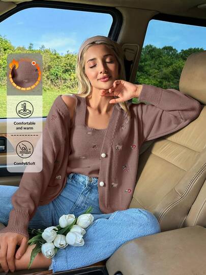 RueChic 刺绣花朵细节开衫和刺绣针织上衣女式毛衣套装 - 咖啡棕 - 查看 1