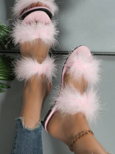 女士羽毛裝飾扁平涼鞋,柔軟的帶子,粉色休閒圓頭性感幻燈片 - 粉色 - 查看 1