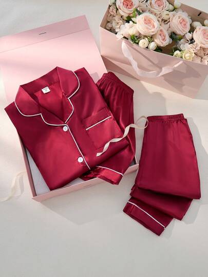 Tween Girl 3 件套睡衣套装 - 浅粉色纯色面料长裤、短裤和短袖有领上衣,休闲家居服 - 酒紅色 - 查看 3