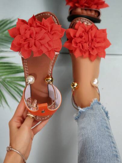 全新加大码女式舒适简约圆头莲花装饰金属珠平底拖鞋凉鞋,休闲时尚户外度假沙滩夏季鞋 - 橘紅色 - 查看 1