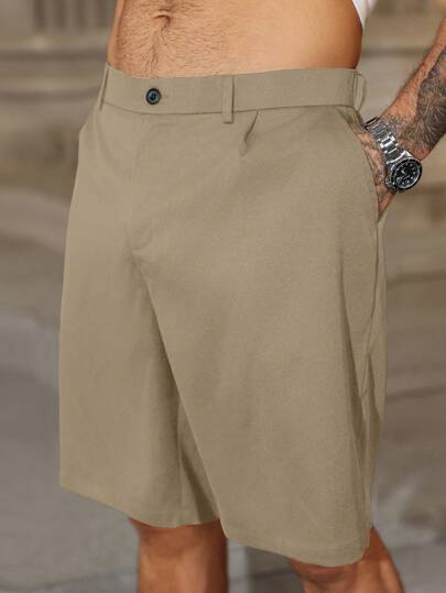 Manfinity Homme 大码男士简约休闲纯色斜口袋短裤 - 卡其色 - 查看 5