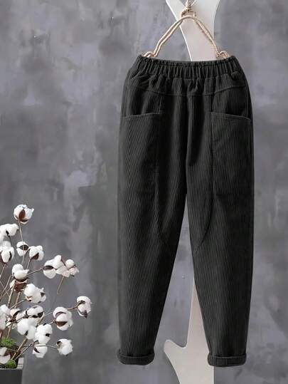 欧美时尚秋冬灯芯绒面料松紧腰口袋长裤 - 黑色 - 查看 1