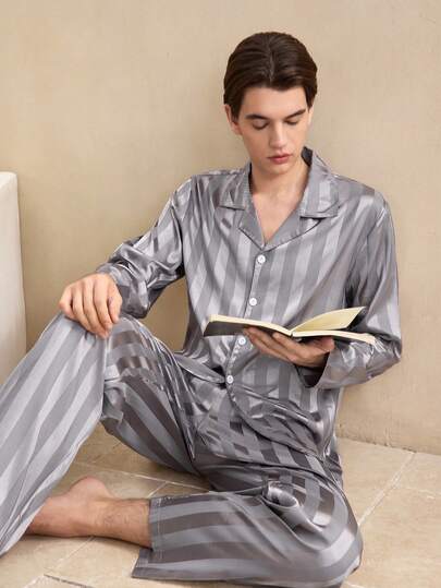 EverLounge 仿丝绸提花男士家居服套装,冬季服装 - 灰色 - 查看 1