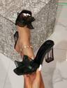 女士高跟凉鞋,蝴蝶结透明网眼透气细跟简约黑色一脚蹬穆勒鞋