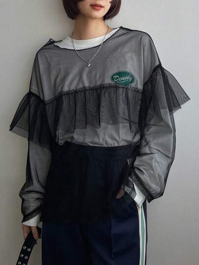 FRIFUL 女士蕾絲網紗透視上衣 - 黑色 - 查看 1
