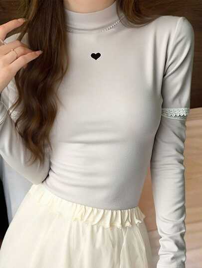 FRIFUL 女士愛心刺繡花邊中空袖立領上衣 - 灰色 - 查看 1