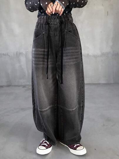 FRIFUL 女士休闲破洞阔腿抽绳腰牛仔裤,宽松牛仔裤 - 黑色 - 查看 1