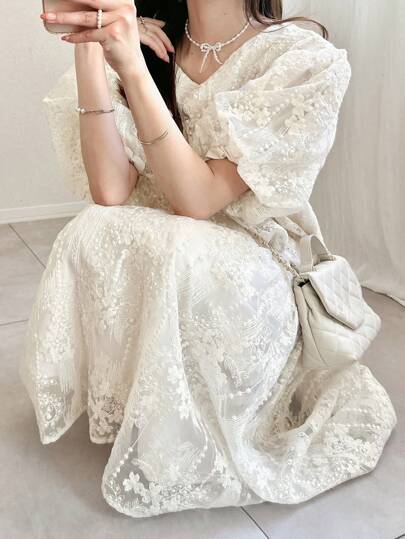 FRIFUL 女士象牙色泡泡袖长款蕾丝连衣裙,浪漫连衣裙,春夏太阳裙 - 杏色 - 查看 1