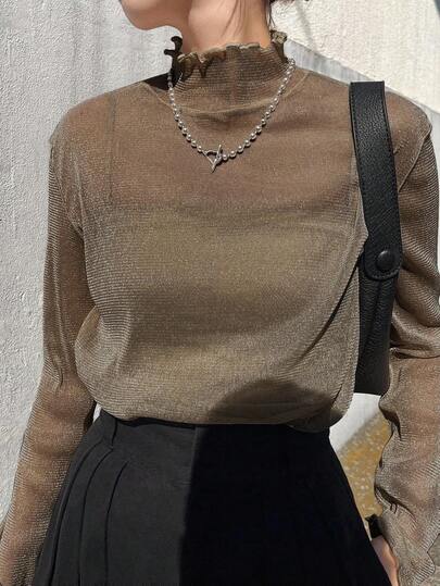 FRIFUL 女式网眼高领透明衬衫,夏季长袖上衣 - 橄欖綠 - 查看 1