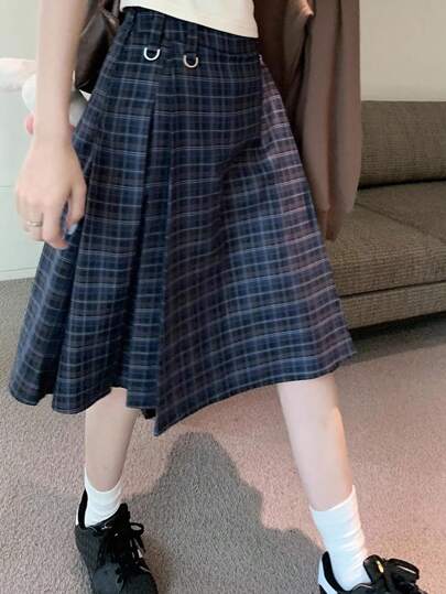 FRIFUL 女式格子褶皱设计休闲学院风半身裙 - 藍色 - 查看 1