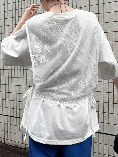 FRIFUL 女士圆领宽松蕾丝系带拼接吊带背心设计休闲通勤T恤 - 白色 - 查看 1