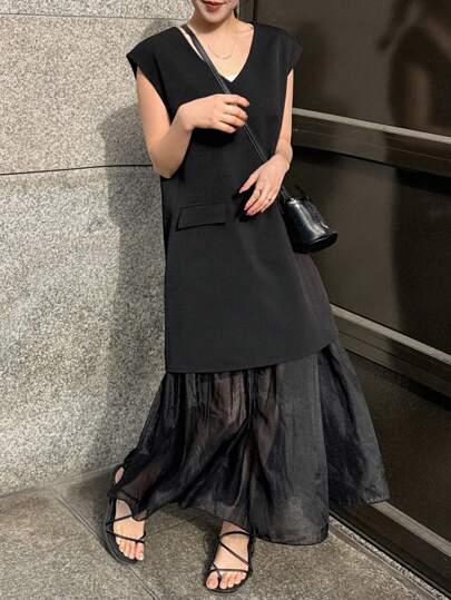 FRIFUL 女士无袖网眼拼布连衣裙,简约时尚休闲日常穿着,荷叶边 - 黑色 - 查看 1