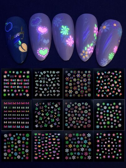 FULL BEAUTY 12张发光花卉图案美甲贴纸 DIY美甲 - 彩色 - 查看 1