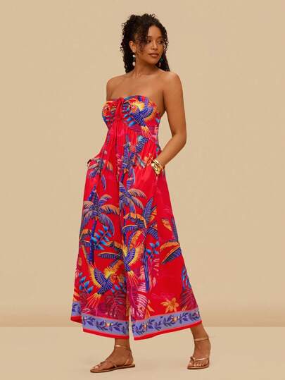 Travachic 大码女式无袖热带红棕榈树和鹦鹉印花连体裤,多种穿着方式,带口袋,休闲度假装,夏季 - 紅色 - 查看 1