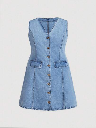 SHEIN MOD 大码夏季休闲无袖收腰 A 字牛仔连衣裙 - 淺色水洗藍 - 查看 1