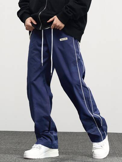 Manfinity Hypemode 男士宽松字母贴片撞色滚边细节抽绳腰裤,长款海军蓝裤子,适合丈夫、男朋友的礼物 - 藏蓝色 - 查看 1