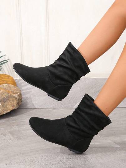 秋冬黑色褶皱套脚鞋,圆头设计,舒适百搭,适合日常通勤穿着,女士踝靴和短靴,宽楦设计,穿着舒适。 - 黑色 - 查看 5
