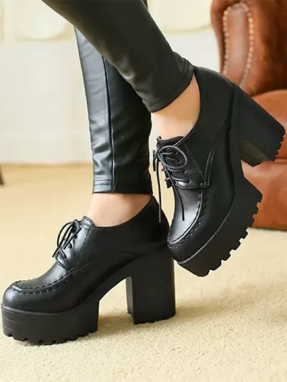 秋冬女士简约系带粗跟高跟鞋,优雅黑色牛津鞋,优雅 - 黑色 - 查看 4