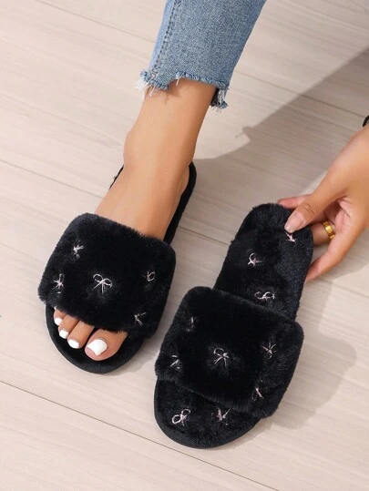 秋冬女士刺绣蝴蝶结家居拖鞋,四季皆宜的毛绒室内拖鞋,平底女士拖鞋,家用地板拖鞋,蓬松拖鞋 - 黑色 - 查看 1