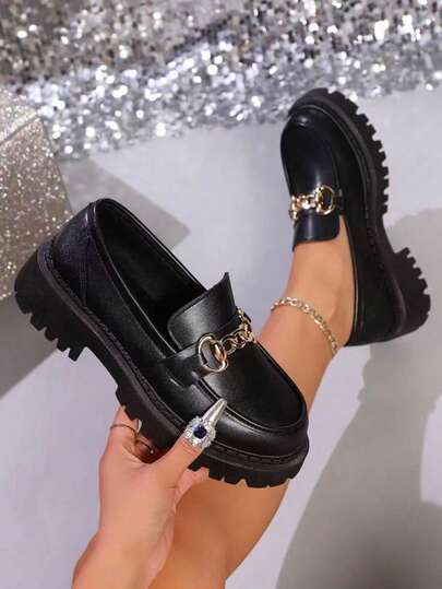 秋冬女士平底乐福鞋,英伦风黑色皮革一脚蹬复古莫卡辛鞋 - 黑色 - 查看 1