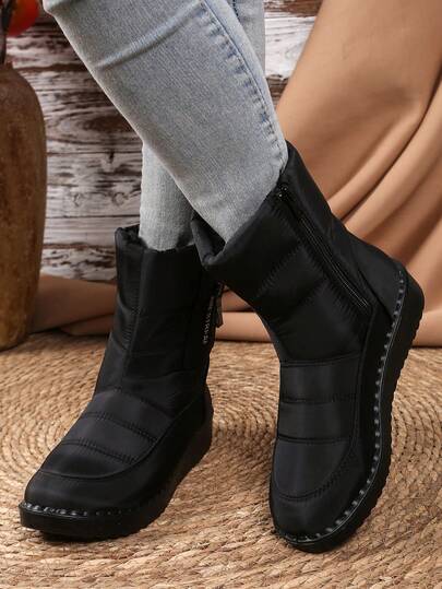 秋冬女士西部风侧拉链伞布套脚中筒靴,新款时尚舒适保暖加厚户外防寒轻便雪地靴,毛绒靴 - 黑色 - 查看 1