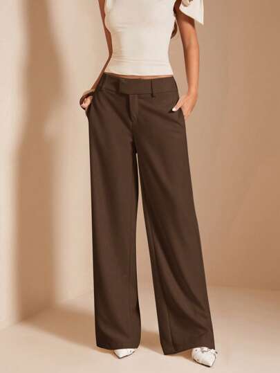 SHEIN BAE 女士纯色奶油白色阔腿裤,休闲低腰裤,适合日常、度假、办公室穿着,春夏季 - 咖啡棕 - 查看 1