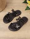 1 双时尚百搭粉色女孩珍珠和水钻蝴蝶结装饰可爱平底凉鞋,圆头,适合日常穿着、跳舞、春秋季户外穿着,闪光装饰包头公主鞋,尺码偏小半码