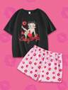 THE POWERPUFF GIRLS X SHEIN 女士蓝色短袖上衣和短裤睡衣套装,可爱卡通,泡泡、花朵、毛茛、云朵彩虹图案,梦幻、基本款休闲又酷炫,女士返校装,返校,学校上衣,基本款上衣,秋冬