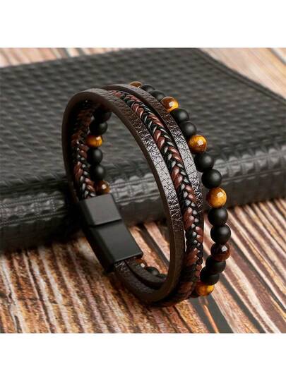 時尚首飾類男士手工製作自然黑曜石串珠手鏈編織腕帶 - 款式1 - 查看 1