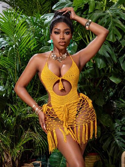 BamGleam 女士纯色简约日常针织连体裤和镂空裙套装 - 黃色 - 查看 1
