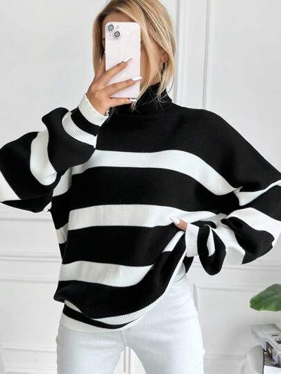 EURMUSE 條紋圖案高領落肩袖套頭毛衣 - 黑與白 - 查看 1