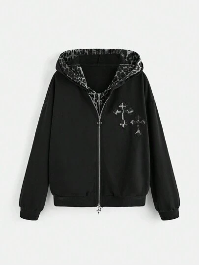 ROMWE Goth Kpop 十字架豹纹二合一拉链连帽衫,适合毕业季、返校季穿着,也适合教师穿着。 - 黑色 - 查看 1