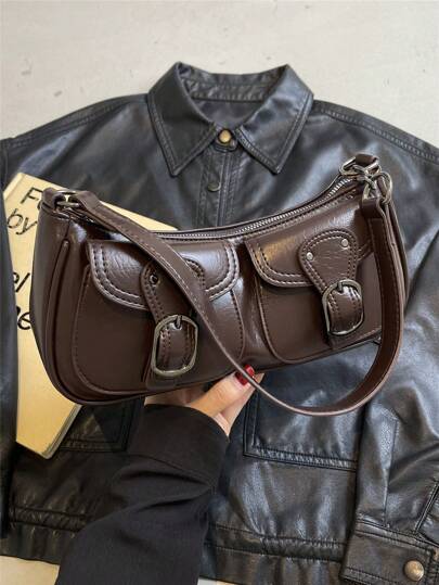 时尚纯色复古单肩包,适合日常通勤和旅行 - 咖啡棕 - 查看 2