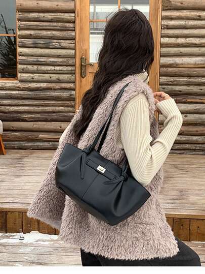 时尚大容量梯形设计奢华PU皮革女士单肩包,设计师款别致锁扣手提包,高品质腋下包 - 黑色 - 查看 1