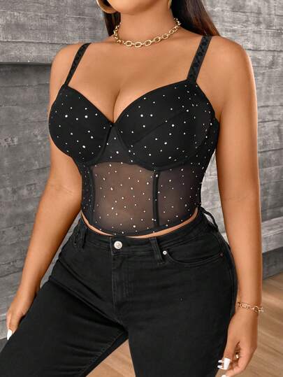 SHEIN LUNE 時尚短款魚骨紋性感修身大碼胸衣 - 黑色 - 查看 1