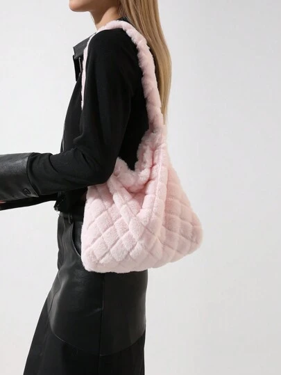 時尚純色女士菱形毛絨單肩包、冬季皮夾和收納包